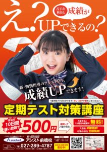 前橋市内の中学生の皆様! 1月も下旬となり、あっとゆう間に3学期期末テストが近づいてきました! 実は・・3学期の期末試験は「学年の成績」を決める最後のチャンスなのです! 「部活の練習でテスト勉強が追いつかない~!」 「授...